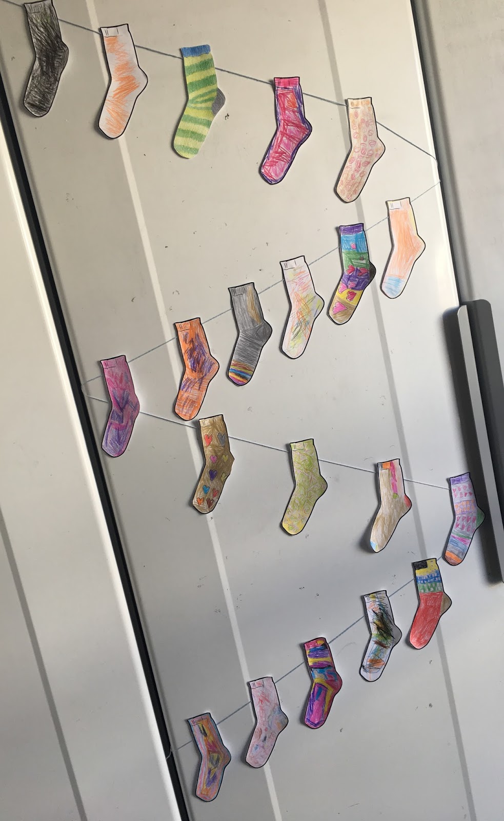Efter samlingen har alla barnen fått rita varsin socka som vi hängt upp på lina i hallen. Ta gärna en kik på hur fina sockor era barn har skapat.